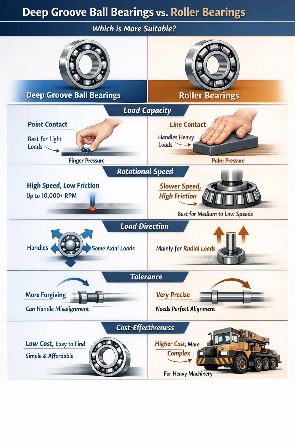 Nel mondo dei cuscinetti non esiste un assoluto "che è meglio", ma solo "che è più adatto". Cuscinetti a sfere a gola profonda e i cuscinetti a rulli sono come scarpe da corsa e scarponi da trekking: ognuno ha i suoi punti di forza.